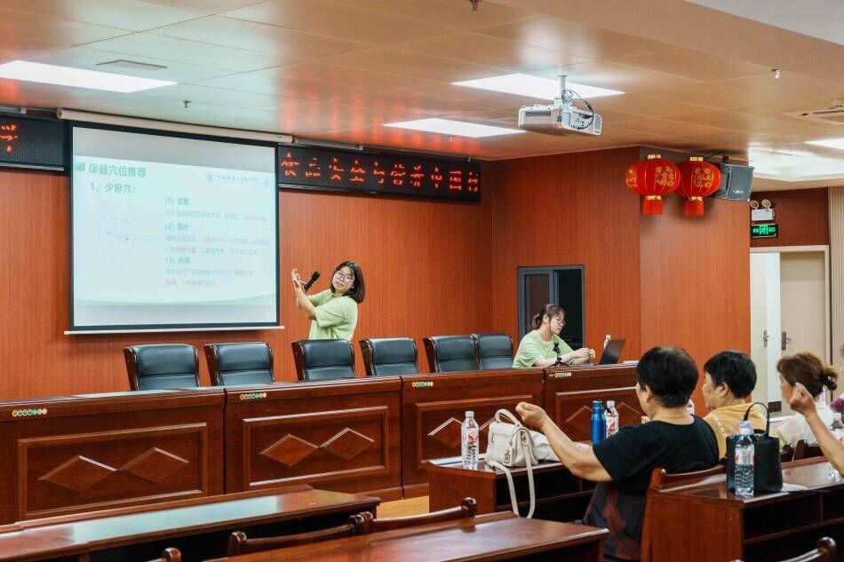 隨后,實踐團另一位講師付欣然結合自身食品營養與健康專業知識背景,為社區居民帶來了一場養心保健穴位教學。她耐心細致地講解了穴位的位置及按摩方法,并通過示范,手把手教大家如何準確找到并按摩養心穴位。參與宣講的社區居民紛紛嘗試,現場氣氛熱烈。