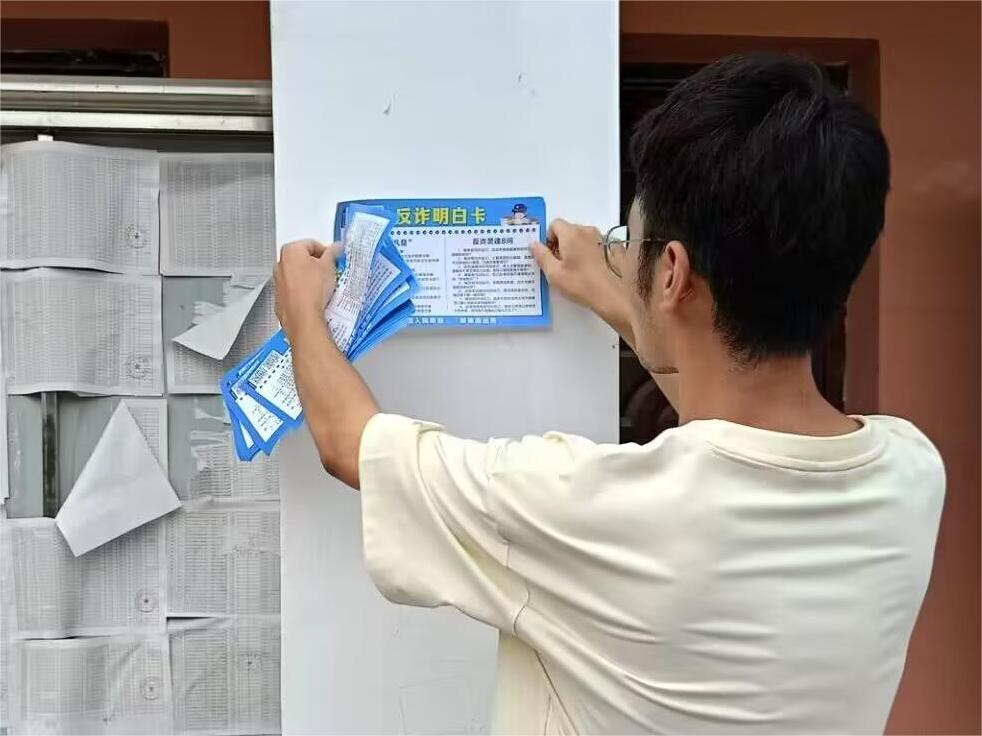 圖為志愿者張貼反詐宣傳單。大學(xué)生之聲 劉浩成 供圖