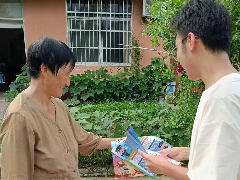 圖為志愿者向村民講解并宣傳反詐知識(shí)與傳單。大學(xué)生之聲 劉浩成 供圖