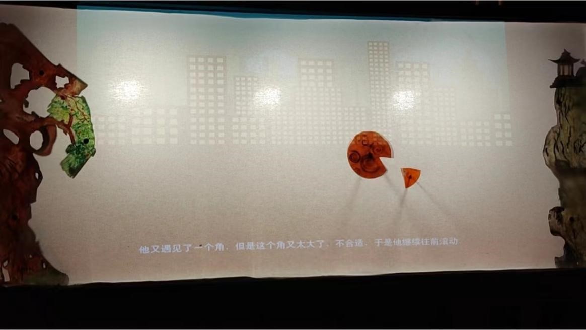 宣傳片結束正式開始皮影演出,共四場,第一個劇目是《蛙鶴龜》,這出劇幕曾經在1955年中國第一屆皮影木偶展中斬獲金獎,講述的是一只青蛙,一只仙鶴還有一只烏龜在池塘邊斗智斗勇的故事,整出劇目沒有一句臺詞,全憑音樂的鼓點和演員的互動來完成。第二個劇目是《石敢當大戰惡狼精》,此劇目非常具有當地特色,在演出中使用泰安的方言讓人倍感親切,劇目中所展現出的石敢當精神充滿魅力,廣受歡迎。個劇目是《尋找失落的一角》,改編自繪本故事,講述一個小球在丟失了一角之后不斷尋找的過程。此劇目的背景的變換,如森林,城市等,采用數字投影變換,場景生動多樣。