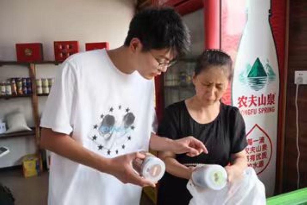 圖為土特產(chǎn)店老板向團隊成員介紹當?shù)剞r(nóng)戶自產(chǎn)山核桃產(chǎn)品時的場景。