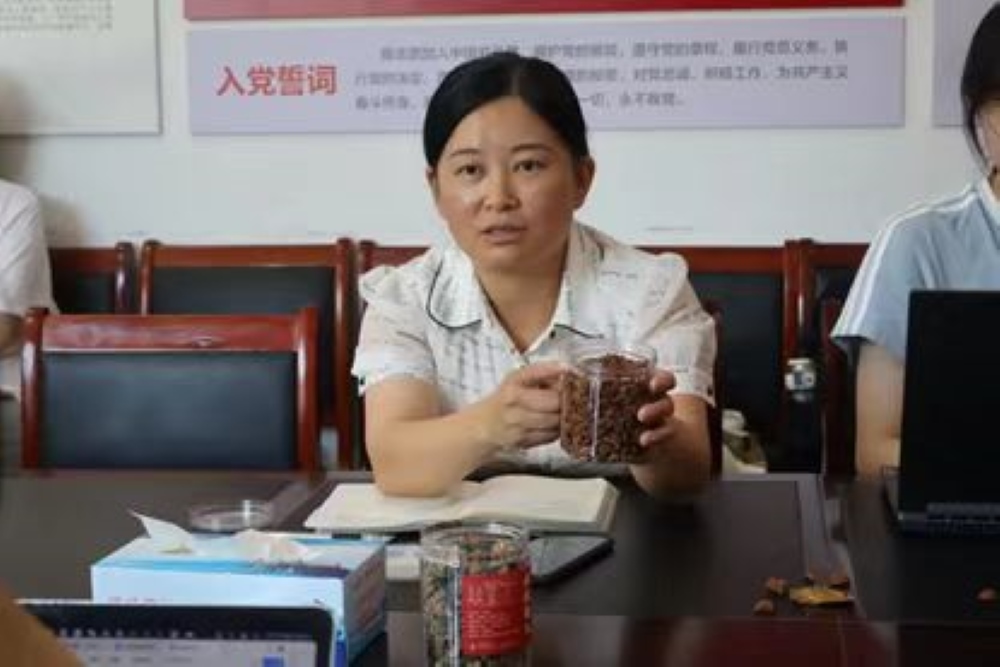 圖為磡頭村洪書記向小分隊成員們介紹家朋鄉(xiāng)山核桃產(chǎn)品時的場景。