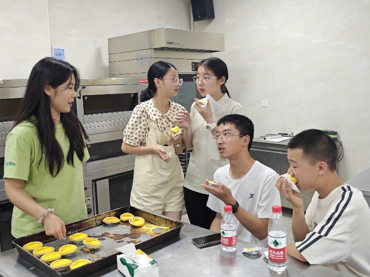 蛋撻烘烤完成后,小朋友們紛紛上前拿起充滿香氣的蛋撻,仔細品嘗兩種蛋撻的區別,并于志愿者們交流,共同探討。羅夢瑤小朋友這樣說到:“我覺得自制蛋撻更好吃一些,口感和奶香味都更豐富!”