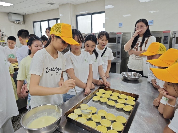 隨后,博士團和孩子們來到烘焙房進行蛋撻制作,志愿者們帶領小朋友們分成三組,并分別介紹制作過程中用到的原料,提醒小朋友們注意自制蛋撻液和成品蛋撻液在烘焙完成后的區別。小朋友們十分自覺主動的參與制作,完成了原料的稱量、仔細準確的進行蛋撻液的調配,將自制蛋撻液和成品蛋撻液進行充分攪拌,有秩序的體驗動手加蛋撻液的過程。
