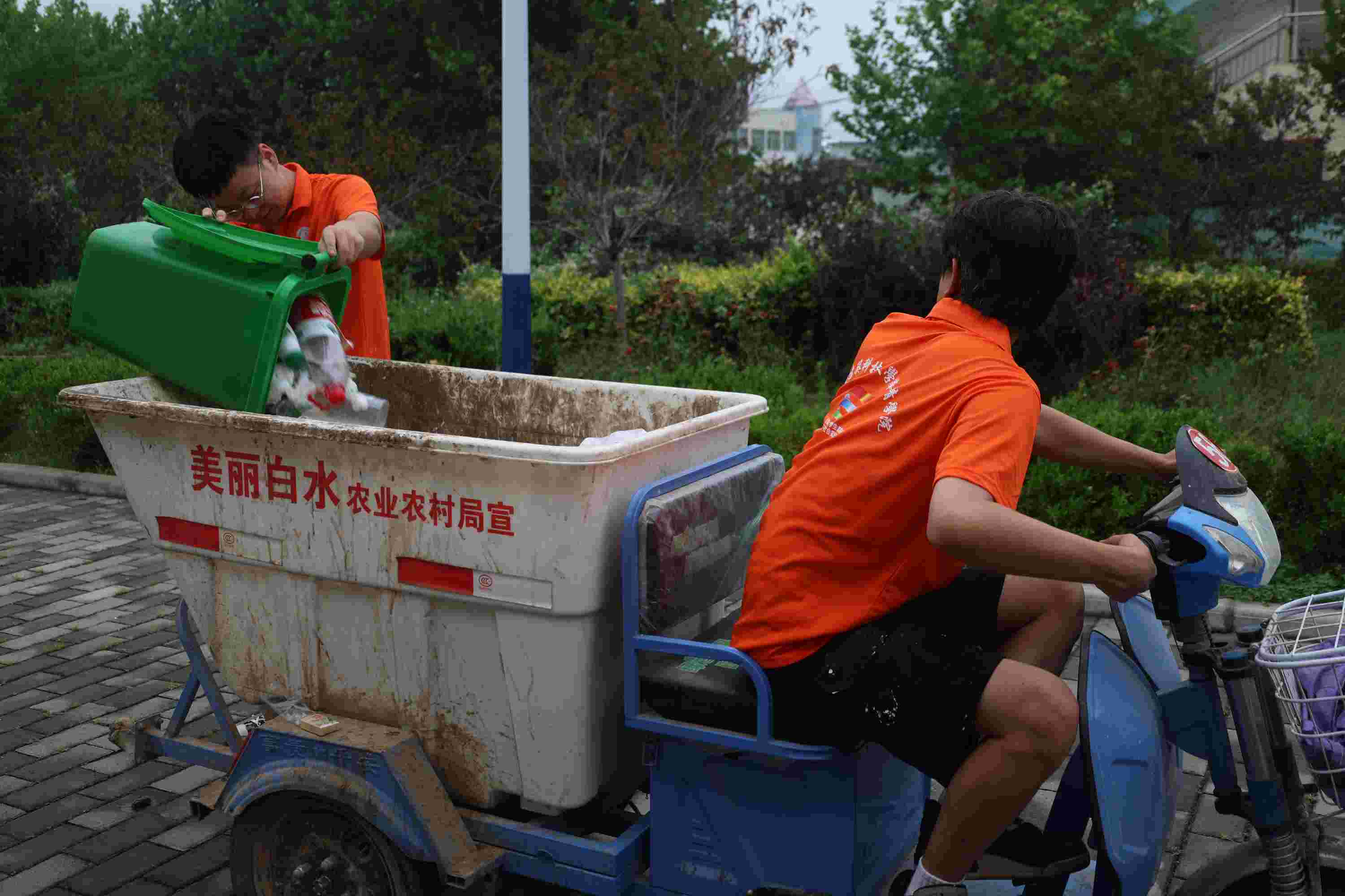 再次,團隊成員還協助村民進行了垃圾轉運清理工作,他們手持清掃工具,推著垃圾清運車,改善了村莊的衛生狀況。