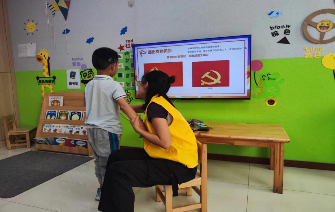 在此之后,為了讓小朋友們加深對(duì)黨徽的記憶,主講人高子涵及兩位實(shí)踐團(tuán)隊(duì)員組織小朋友們自己動(dòng)手畫一畫,為黨徽填上正確的顏色。小朋友們?cè)诒竟?jié)課上都明白了黨徽是極其莊嚴(yán)的,因此在涂色時(shí)也是十分嚴(yán)肅認(rèn)真的對(duì)待,小心翼翼的為黨徽填上鮮艷的紅色以及耀眼的金黃色。繪畫是小朋友們感知世界、參與生活的最初方式之一,讓小朋友們用手中的畫筆,勾勒出對(duì)祖國(guó)的熱愛,通過(guò)這一形式,小朋友們?cè)诒竟?jié)課上都做到了對(duì)黨徽印象深刻。