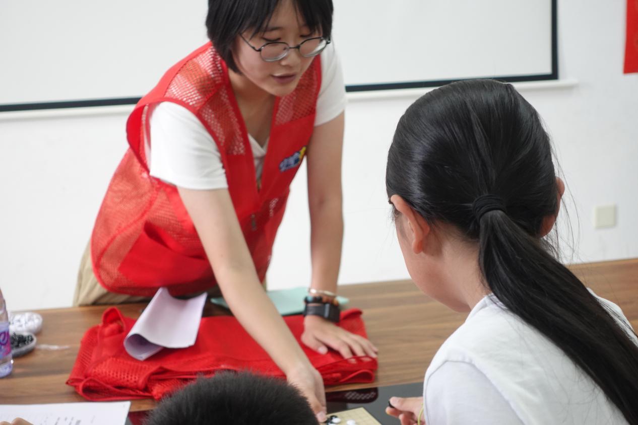 (大學生志愿者郭美儀將孩子們進行分組。孩子們開始第一次自主下圍棋并能夠自己判斷勝負。大學生志愿者郭美儀在孩子下棋過程中進行指導,針對不同孩子的不同掌握情況進行進一步的補充。)