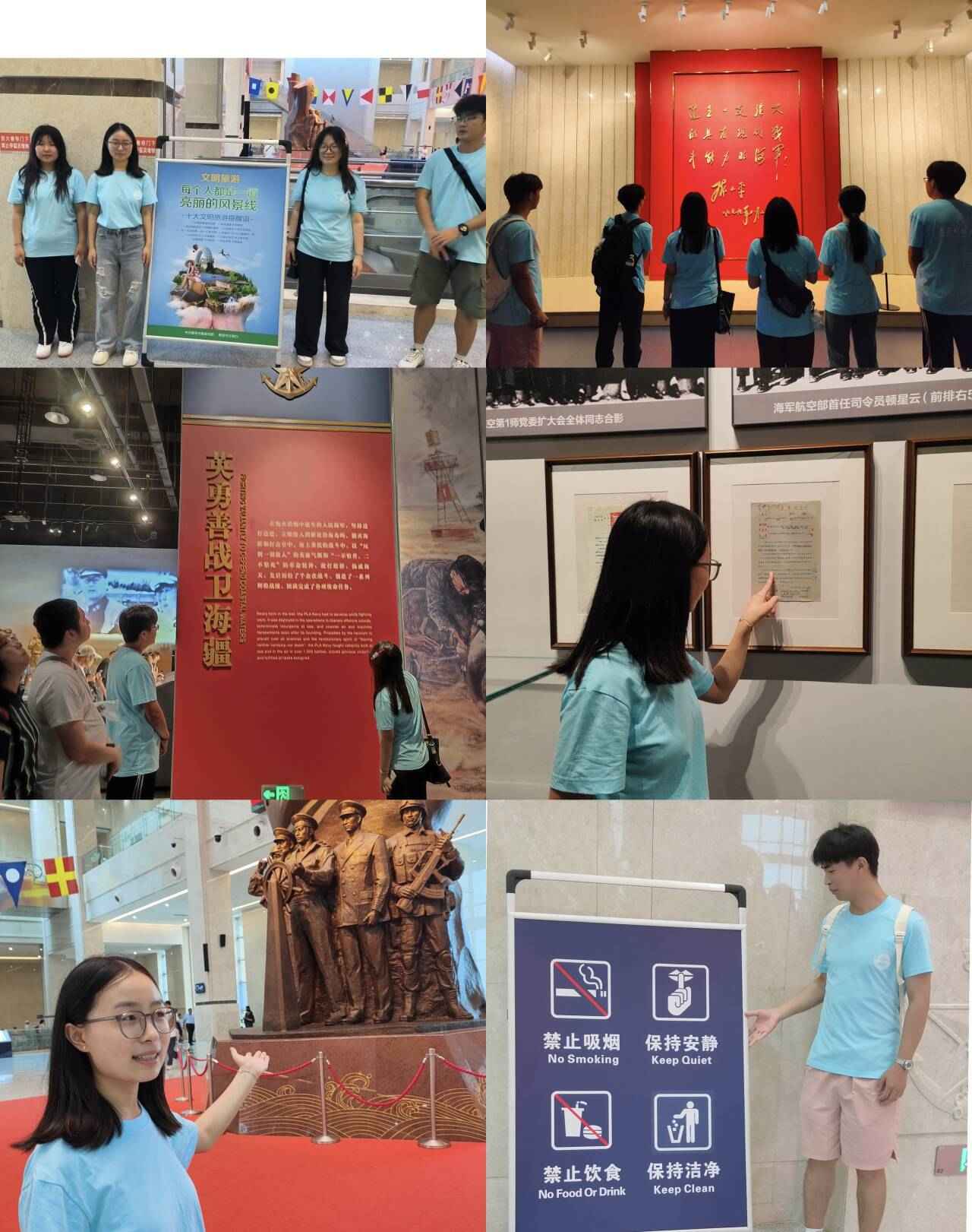 為了深入貫徹習近平新時代中國特色社會主義思想,積極弘揚社會主義核心價值觀,實踐團隊赴青島市海軍博物館開展實踐活動?;顒又校瑘F隊在細致參觀、了解了海軍發展歷程、積累了豐富的歷史文化知識的同時,成員們秉持著“文明旅游”的理念,積極引導游客文明禮貌的參觀,當遇到行動不便的游客時,他們及時提供輪椅服務,并細心引導至無障礙通道,讓游客們感受到了來自社會的溫暖與關懷;在休息區,為游客遞上免費的文明旅游手冊,倡導大家共同維護博物館的寧靜與秩序。在戶外區域,針對可能損害文物的行為,團隊成員迅速介入,以簡明扼要的方式普及文物價值,激發游客對歷史文化的敬畏之心,共同守護這份不可再生的寶貴財富。團隊成員的行動不僅展現了團隊專業素養與人文關懷,更讓游客在參觀過程中深刻體會到了文明旅游的重要性,共同促進了旅游環境的和諧與美好。