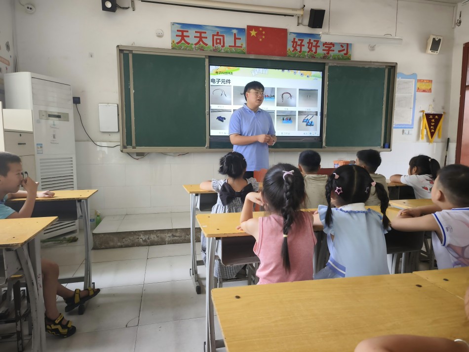 弘揚科技之光,播種希望之種。隊員們精心設計“電路科普小課堂”,向小朋友們科普電學知識,開展電學實驗。隊員們首先借助圖片和實物展示相結合的方式,用簡單易懂的語言介紹基礎電學知識,讓孩子們對電子元件的種類及功能有了更直觀的認識。同時,志愿者們還耐心科普生活用電安全小知識,包括插座使用、電器操作、避免電擊等方面的常識,通過有獎競答充分調動小朋友們的積極性,讓現場氣氛熱鬧非凡。在動手實踐環節,小朋友們仔細聆聽實驗步驟和安全事項,認真進行實操演練。面對復雜的電路知識,他們迎難而上,嘗試各種新奇的電路連接方法,從點亮一個簡單的小燈泡,到熟練運用光敏電阻調節燈泡亮度,每個孩子的臉上都洋溢著自豪和喜悅之情。