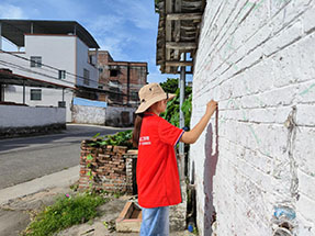 頂著炎炎烈日,實踐團成員們或者蹲,或者站,他們一筆一畫地認真描繪著,每一次上色都格外用心。“彩繪一上墻,感覺我的房子一下子變得有‘排面’了!看著就高興!”垌尾村村民表示。