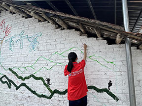 圖為油你成蔭實踐團成員正揮動畫筆,為潔白的墻面添色彩。李鑫 攝