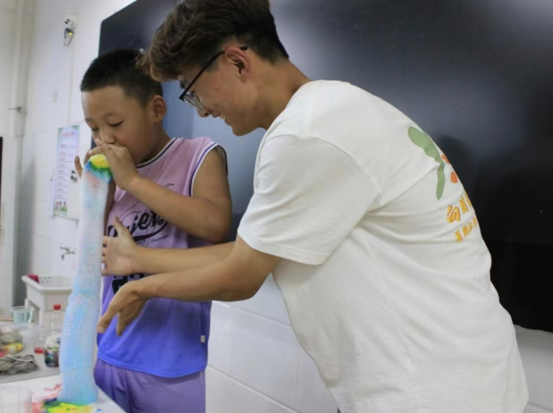 圖為實踐團成員和孩子們一起實驗,山東理工大學趙一提供