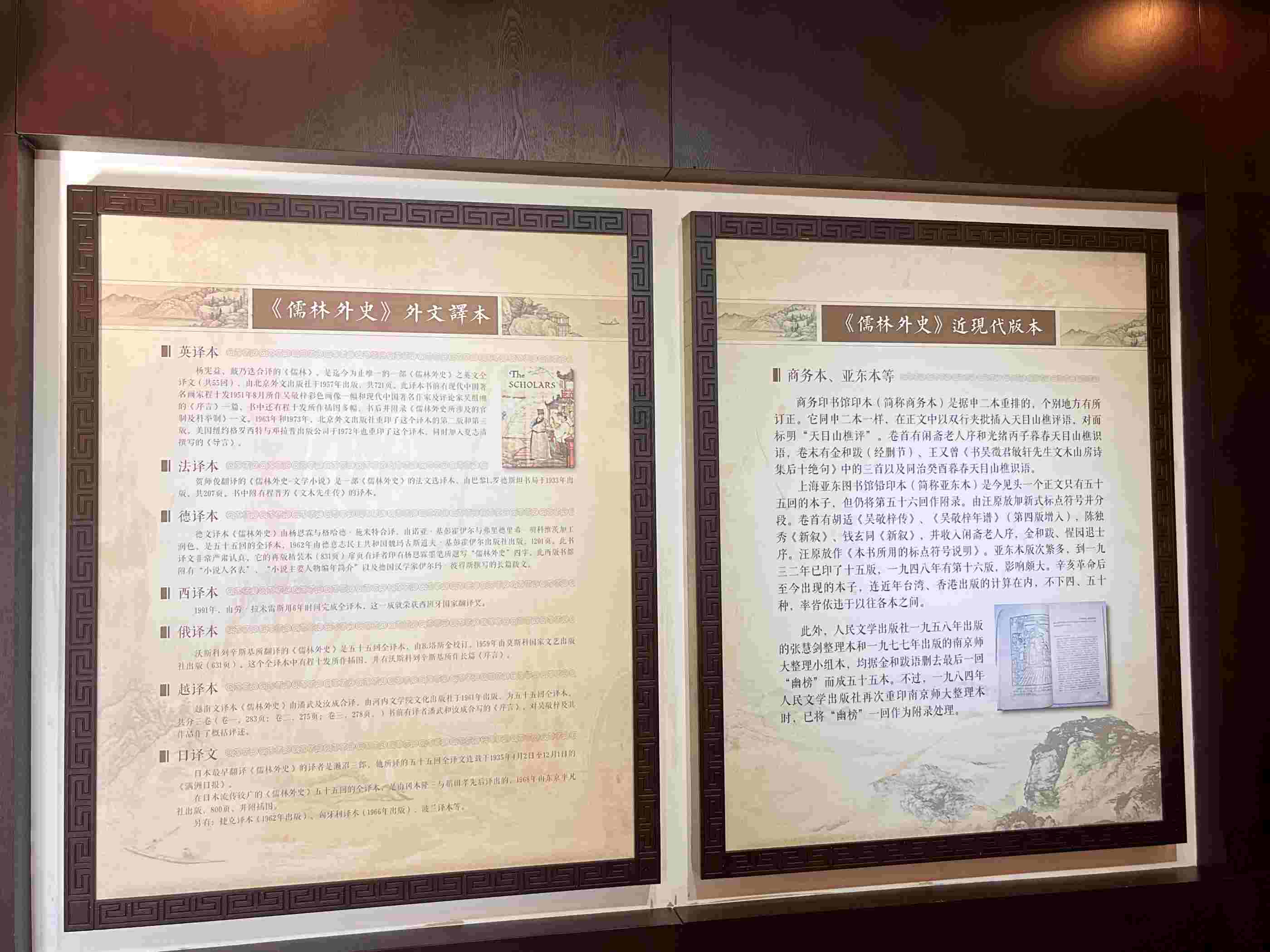 圖為《儒林外史》各種版本記載。于是隨后團隊成員便來到全椒縣吳敬梓紀念館。全椒縣吳敬梓紀念館主體建筑坐北朝南,裝飾手法以明清風格為前提,分為三廳兩廡兩回廊組成的仿明清風格的古典式建筑,既收南方園林之秀,又納北國古建之雄。紀念館設門廳、過廳、正廳、展廳四部分,運用版面、燈箱、通柜、獨立柜、塑像等不同表現形式。總陳列展覽面積為1600平方米,共7個展廳,分別為:分為:吳學研究資料廳、吳敬梓家世廳、吳敬梓生平廳、正廳、衣冠冢、西墅草堂、接待室。館內藏品主要來源于考古發掘、社會捐贈、征集等。藏品類別有石刻、陶瓷器、青銅器、字畫等。