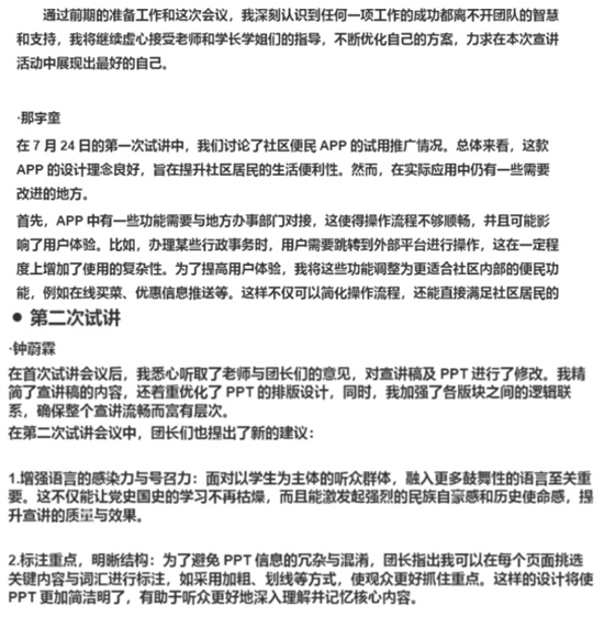 在暑期實踐開展過程中,成員們積極準備宣講內容,完成工作任務,認真思考并修改出現的問題,不斷總結反思,在每次例會之后撰寫團隊成員的會議心得。