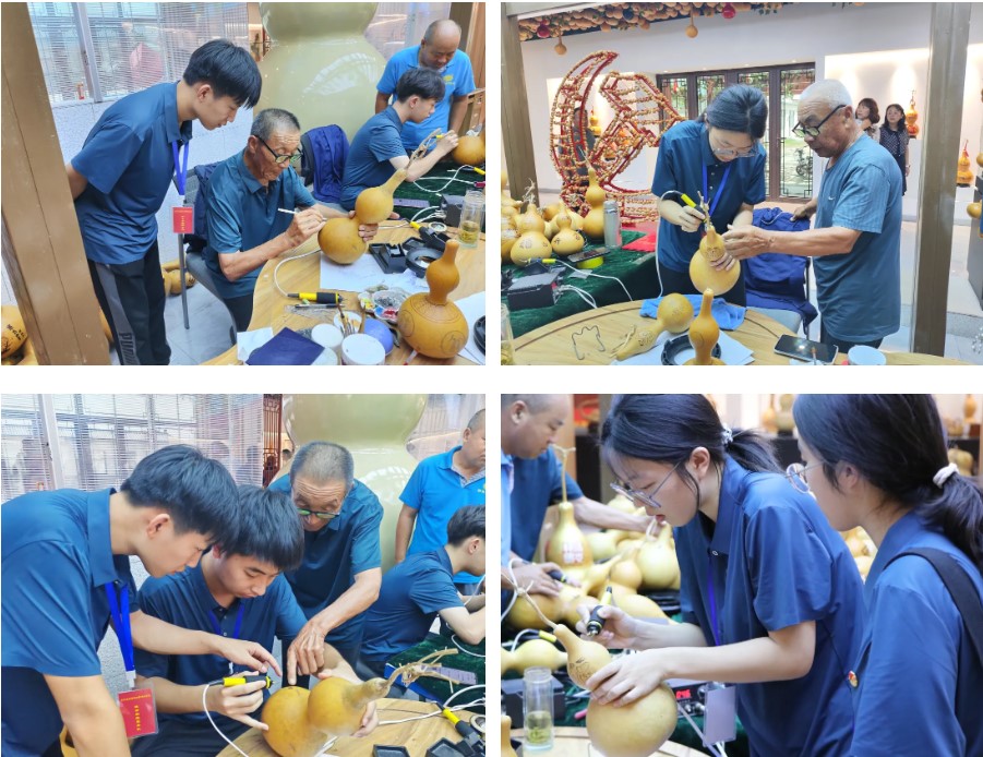 師生共同參觀非遺工坊師生參觀烙畫葫蘆藝術(shù)品,了解葫蘆藝術(shù)品的各種造型與寓意。烙畫葫蘆藝術(shù)品的獨(dú)特風(fēng)格,可以用“自然與藝術(shù)的完美融合”來形容。它們不僅保留了葫蘆本身質(zhì)樸、圓潤(rùn)的自然形態(tài),更通過匠人的巧手,將細(xì)膩的情感與豐富的想象力融入其中,創(chuàng)造出一種既質(zhì)樸又高雅、既傳統(tǒng)又現(xiàn)代的藝術(shù)風(fēng)格。烙畫葫蘆藝術(shù)品以其獨(dú)特藝術(shù)魅力,給予師生古樸典雅、回味無窮的藝術(shù)享受。葫蘆烙畫獨(dú)特藝術(shù)瑰寶讓師生認(rèn)識(shí)到保護(hù)和傳承非物質(zhì)文化遺產(chǎn)的重要性。