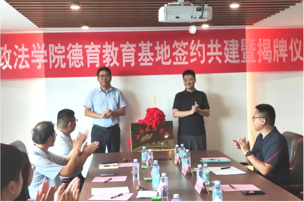 山東政法學(xué)院德育教育基地揭牌,副院長(zhǎng)孫杰與開元新村黨總支書記高世文簽訂共建協(xié)議書。