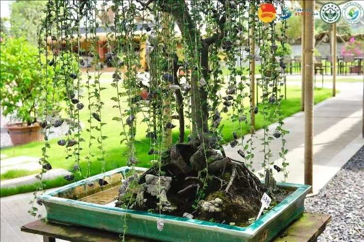 丹霞小石積是薔薇科小石積屬植物,通常高達1-3米,呈小枝圓柱形,奇數羽狀復葉,具小葉片7-15對。為了讓枝條像瀑布一樣向下生長,每一個枝干上綁著一顆顆小石頭,具有很高的盆景觀賞價值。