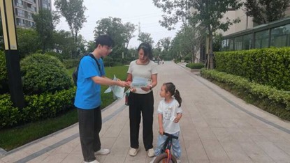 圖為志愿實踐小隊成員派發宣傳單頁并對居民進行科普 鄭州輕工業大學陳賀峰攝