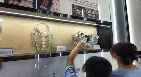圖為團(tuán)隊成員欣賞苗族銀飾
