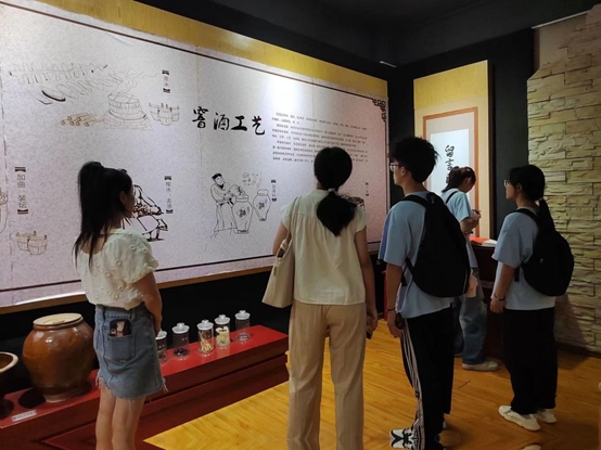 圖為講解員向?qū)嵺`團(tuán)成員講解窨酒工藝