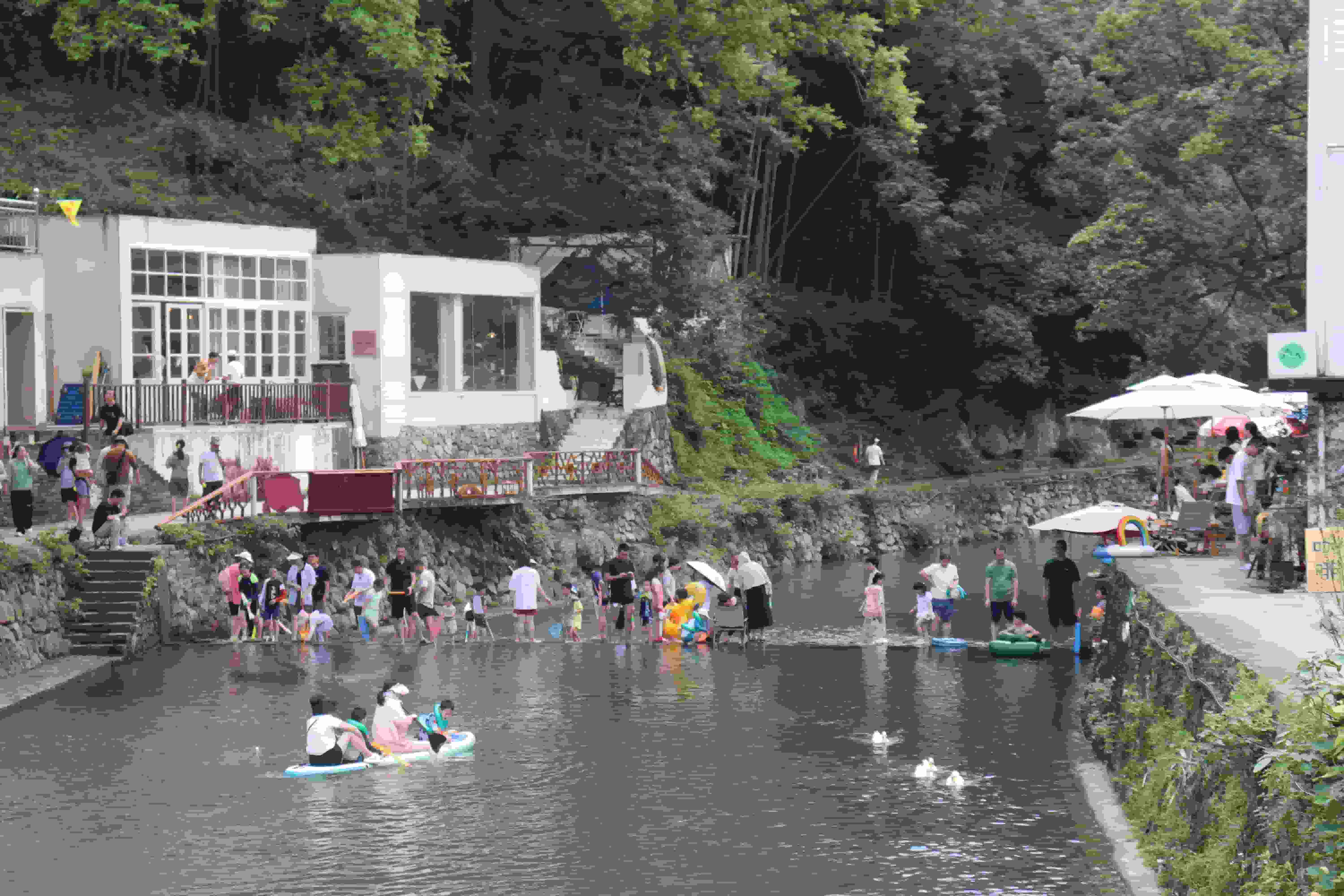 行駛過(guò)蜿蜒的山路,城楊村出現(xiàn)在開(kāi)闊的視野中,被漫山的竹林環(huán)繞。周末來(lái)村子里的人特別多,有家長(zhǎng)帶著小孩來(lái)溪中玩水,有朋友幾個(gè)在溪中搭上天幕一起露營(yíng),是夏日清涼好去處,溪邊還有許多網(wǎng)紅咖啡店,吸引了許多遠(yuǎn)道而來(lái)的年輕人。
