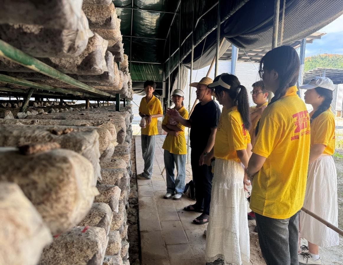 在當地菇農余新考的帶領下,隊員們實地參觀了食用菌生長的多個環節。了解菇棚種植食用菌種植的不同階段,從菌棒的制作到消毒殺菌,再到食用菌的生長周期以及采摘的階段。余新考從專業的角度向我們逐一介紹。通訊員