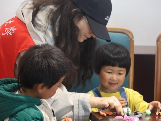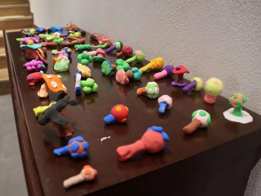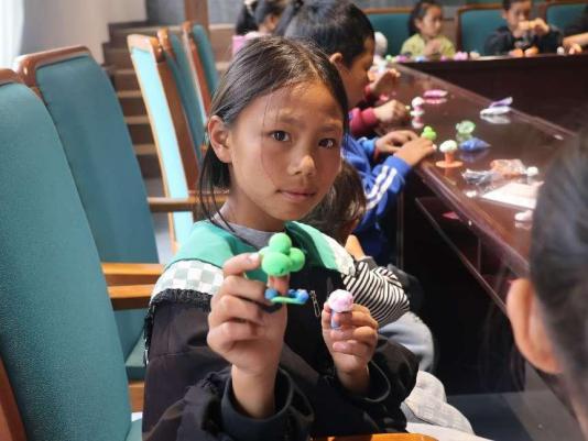 課程第二階段為黏土教學。老師們為孩子們一一介紹黏土材料用具、制作過程并發放黏土,在講解蘑菇黏土的基礎上讓孩子們自由發揮,制作自己喜歡的黏土造型。玫瑰花、葡萄、飛機、動物等各類精美的黏土作品由此產生。