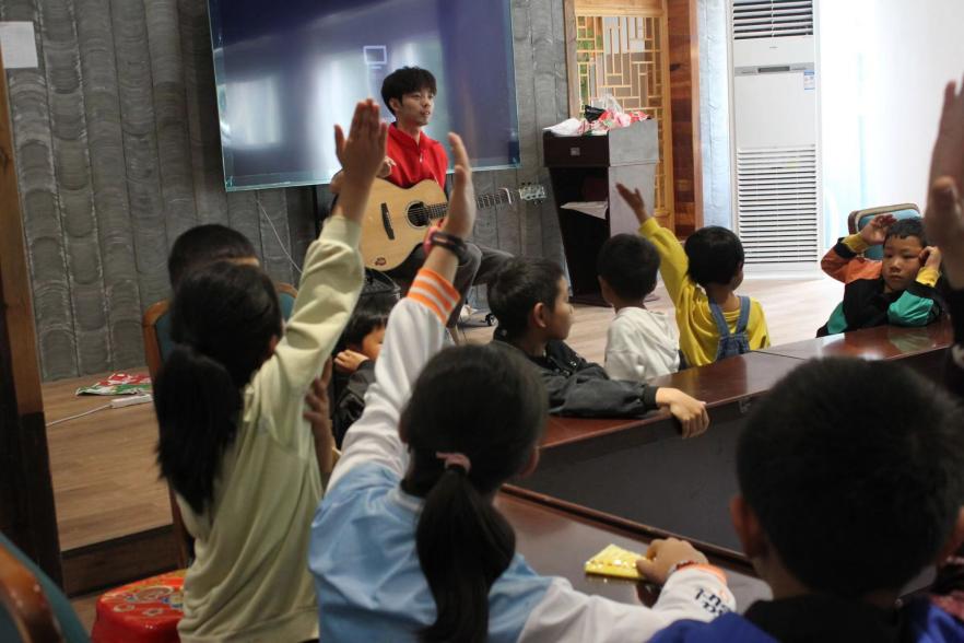 音樂課程由實踐隊成員陳彬進行教學。課程中,團隊成員陳彬從音律、歌詞、節奏等方面指導小朋友們完成《夜空中最亮的星》和《蟲兒飛》兩首歌曲的學習。同時,設置有趣的提問和上臺表演環節促進小朋友們更好地融入課堂氛圍、欣賞音樂之美。