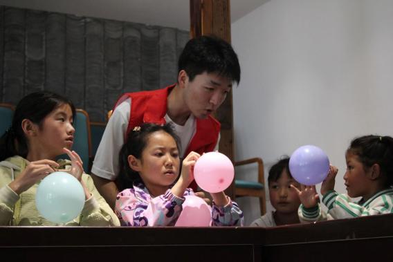 科學小實驗課程以理論與實驗相結合的方式進行,主要圍繞靜電感應開展。首先,實踐隊成員們通過列舉日常生活中的例子解釋什么是電,并以PPT展示的方式對于靜電感應現象進行了初步講解。其次,以氣球為實驗載體,通過吸附碎紙屑及推動塑料杯實驗,將看不見摸不著的電有形化。