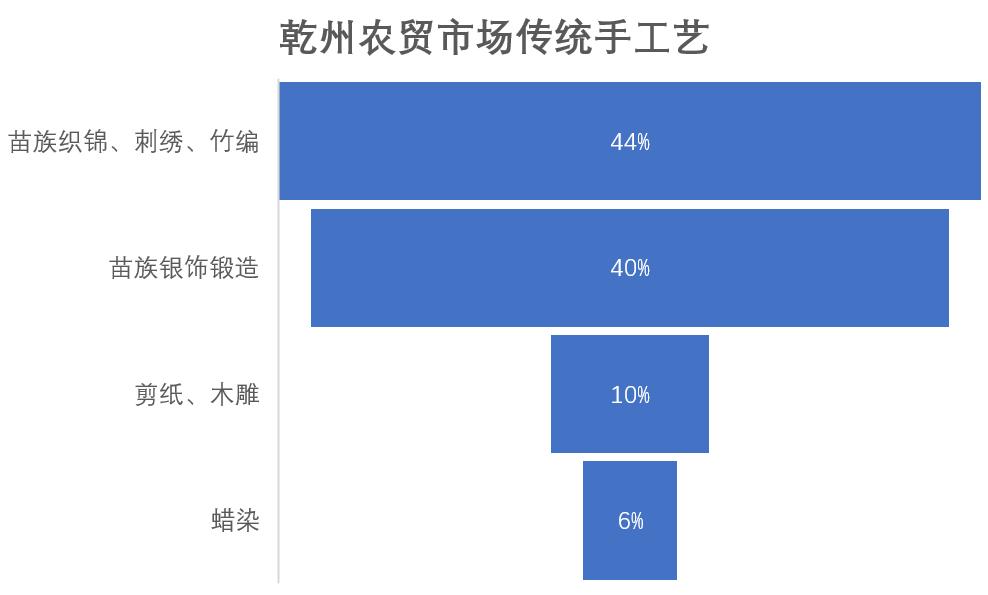 目前,乾州農(nóng)貿(mào)市場注冊有苗族銀飾店、刺繡服飾店多家,正在積極探索更加全面、完善的經(jīng)營模式。苗族銀飾鍛造和苗族服飾、竹編等各占二層市場的40%左右。