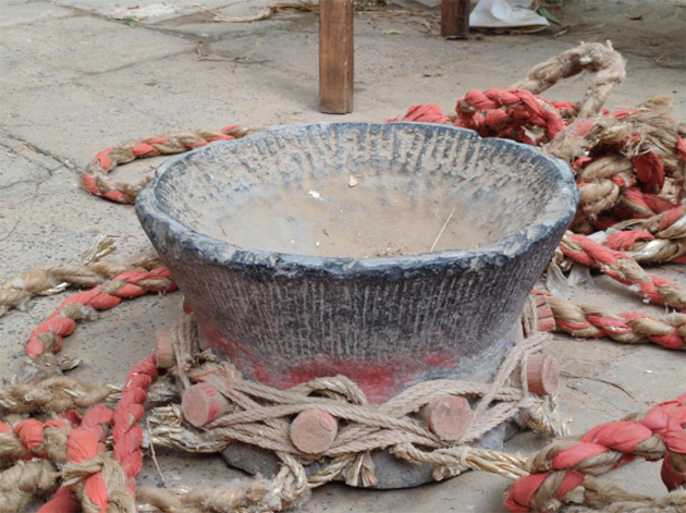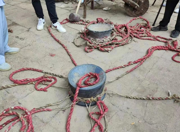 王老師為實踐團講述硪的來源,硪是砸實地基的一種勞動工具,當時的硪通常由石質或鐵質材料制成,十分沉重,形狀一般為圓形,硪的具體形制和大小可能會有所不同,其重量也有差異,常見的硪重量從25公斤到180公斤不等。說罷并從房子里拿出來兩個硪,一個是由石質制成,大約有80斤;另一個由塑料制成,用于表演工具。王老師還講述了在打硪時需要一種民間歌謠,這種歌謠旋律樸實、節奏明快、雄渾有力。