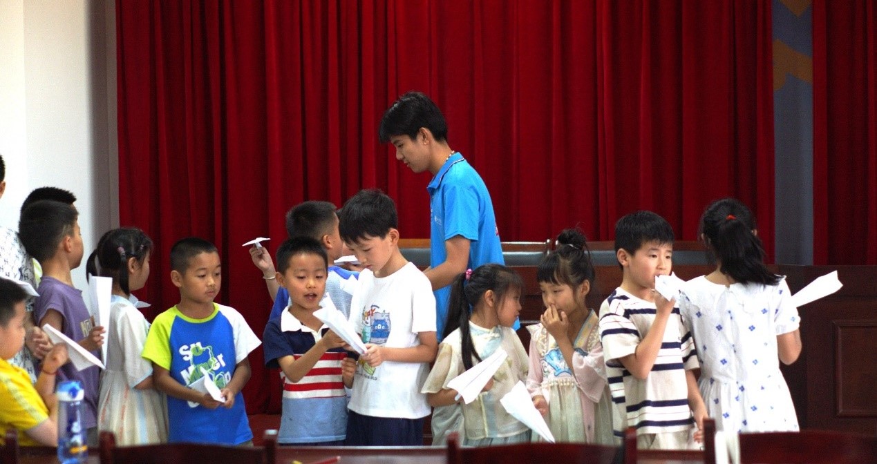 圖為實(shí)踐隊(duì)員帶領(lǐng)兒童們進(jìn)行紙飛機(jī)大賽,以紙飛機(jī)為載體,將兒童的夢(mèng)想和對(duì)未來的期盼呈現(xiàn)出來,以一種美好有趣的方式引導(dǎo)孩子們思考自己的未來 盧皇宇/提供