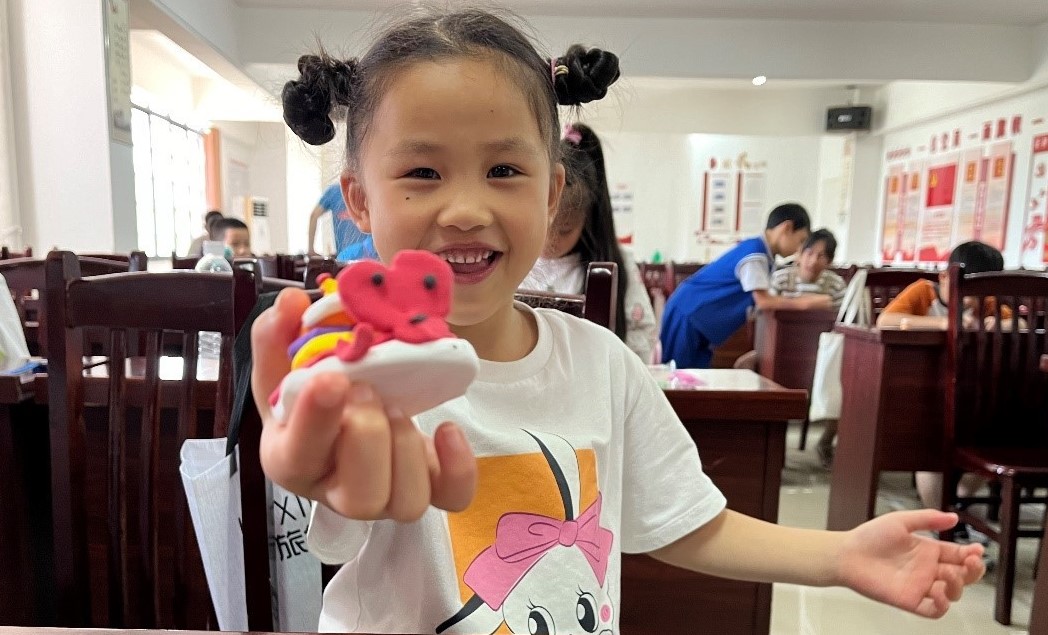 圖為兒童與自己捏好的粘土合照,兒童臉上洋溢著美滿的笑容,對(duì)自己的作品非常喜愛 王浩然/提供