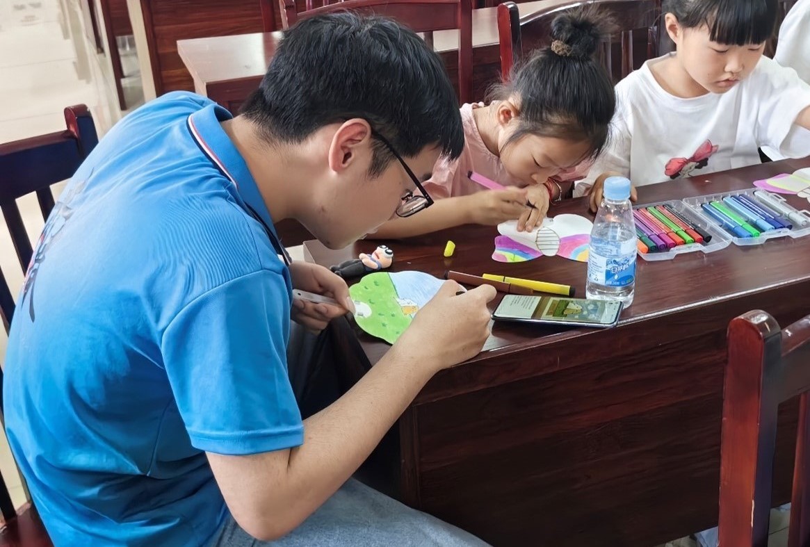 圖為實(shí)踐隊(duì)員在活動(dòng)中與兒童一起繪畫出自己心儀的扇子 盧皇宇/提供