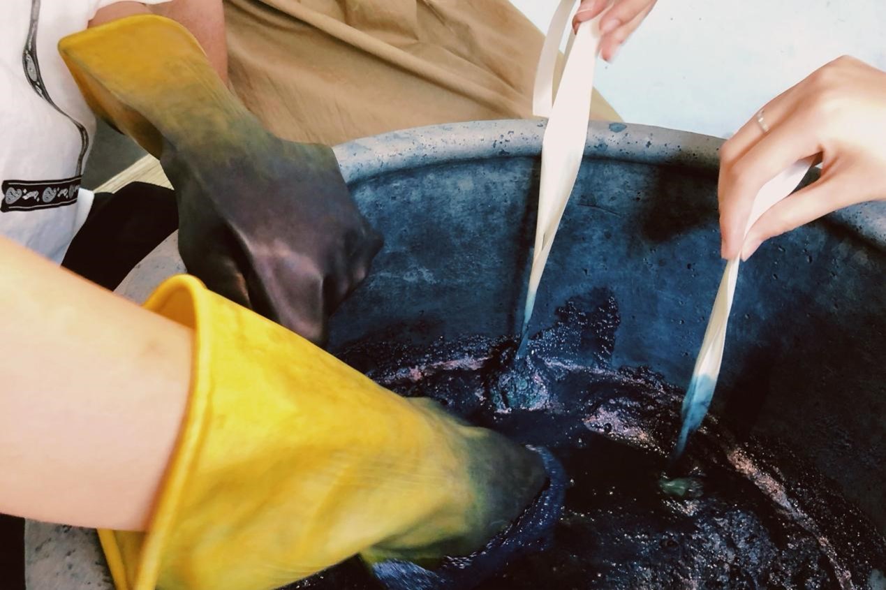 每一浸染,皆顯本真之色從未有花自始即為花,其綻放之努力,令人欽佩,通過不懈奮斗,綻放出耀眼光芒。染布工藝亦復(fù)如是,經(jīng)由反復(fù)浸染,色彩印記逐漸加深,皆為時間淬煉之見證。據(jù)劉老師所述,染液之原料取自天然植物,如板藍(lán)根、寥藍(lán)等,制得靛泥,再加入高度白酒、草木灰或工業(yè)堿、清水、冰糖等,在適宜的氣候條件下,經(jīng)過發(fā)酵,最終制成染料。將制備好的棉布浸入染缸,每次浸入,顏色便加深一分。在適宜的氣候與充分發(fā)酵的條件下,染缸內(nèi)的染料呈現(xiàn)青色,所染出的棉布亦顯青色,隨后在適宜的環(huán)境下,顏色逐漸轉(zhuǎn)變?yōu)樗{(lán)色。正如中國古代哲學(xué)家荀子的《勸學(xué)》一書中的“青,取之于藍(lán)而青于藍(lán)。”青與藍(lán)就在時間的加持下轉(zhuǎn)換,最終的作品也在時間與溫度的烹煮下展現(xiàn)眼前。