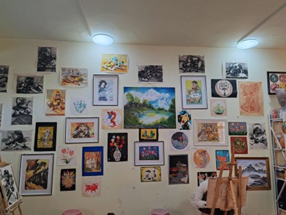 在學生創作的間隙,實踐隊員對楊云老師進行了深入的訪談。楊老師來自一個藝術世家,自幼受到家族中手工藝人的熏陶,從而決定繼承這一傳統技藝。作為該技藝的第五代傳人,楊老師不僅致力于作品的設計與創作,還通過藝術教育機構將此技藝普及給更多的人群。他不僅在校園內指導學生學習這項技藝,還積極前往各學校開展教師培訓,以及推動非物質文化遺產進校園、進社區的活動。在訪談過程中,實踐隊員注意到了楊老師兩位特殊學生的表現,盡管他們面臨表達上的困難或使用助聽器,卻依然能夠展現出更為卓越和專注的特質,生動地詮釋了“上帝為他們關閉了一扇門,必將為他們開啟另一扇窗”的哲理。