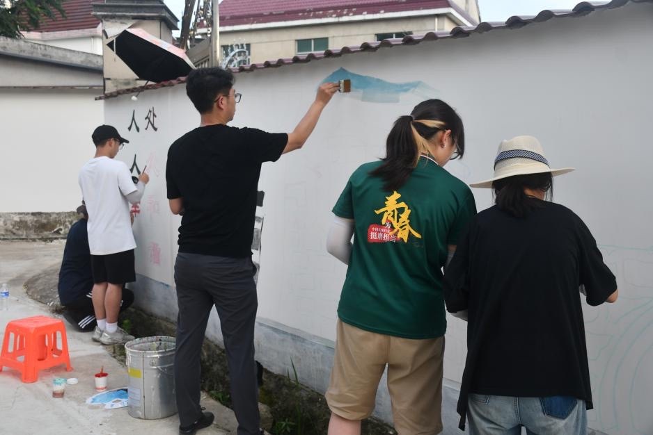 揮毫潑墨:墻繪創作正當時接下來的幾天里,志愿者們分成幾個小組,分別負責不同區域的墻繪工作。他們蹲在地上仔細勾勒,每一筆都凝聚著他們的心血和汗水。在烈日下,他們的衣服被汗水浸透,但臉上的笑容卻從未消失。他們知道,自己正在用畫筆為洋川村描繪一個更加美好的未來。其中,最引人注目的莫過于村口那面巨大的文化墻。志愿者們以“鄉村振興,美麗洋川”為主題,設計了一幅生動的畫面:青山綠水間,農舍錯落有致,村民們笑容滿面,孩子們在田野間追逐嬉戲。這幅墻繪不僅展現了洋川村的自然風光和人文情懷,更寄托了村民們對美好生活的向往和追求。隨著時間的推移,一幅幅精美的墻繪作品逐漸呈現在村民們的眼前。它們或講述著洋川村的歷史故事,或描繪著鄉村的田園風光,或傳遞著積極向上的生活態度。這些墻繪作品不僅美化了村莊的環境,更激發了村民們對家鄉的熱愛和自豪感。
