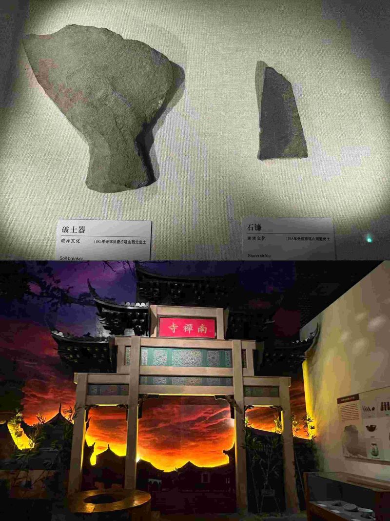 圖為史前時期石器和南禪寺正門復(fù)刻版。通訊員王雨婷 供圖