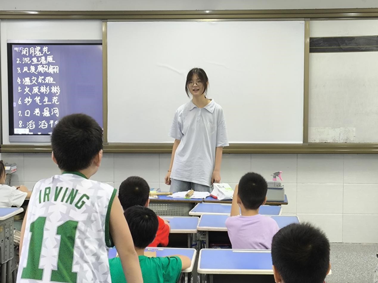 圖為蒲公英實(shí)踐團(tuán)團(tuán)隊成員為孩子們上語文課。 徐舒婷 摂