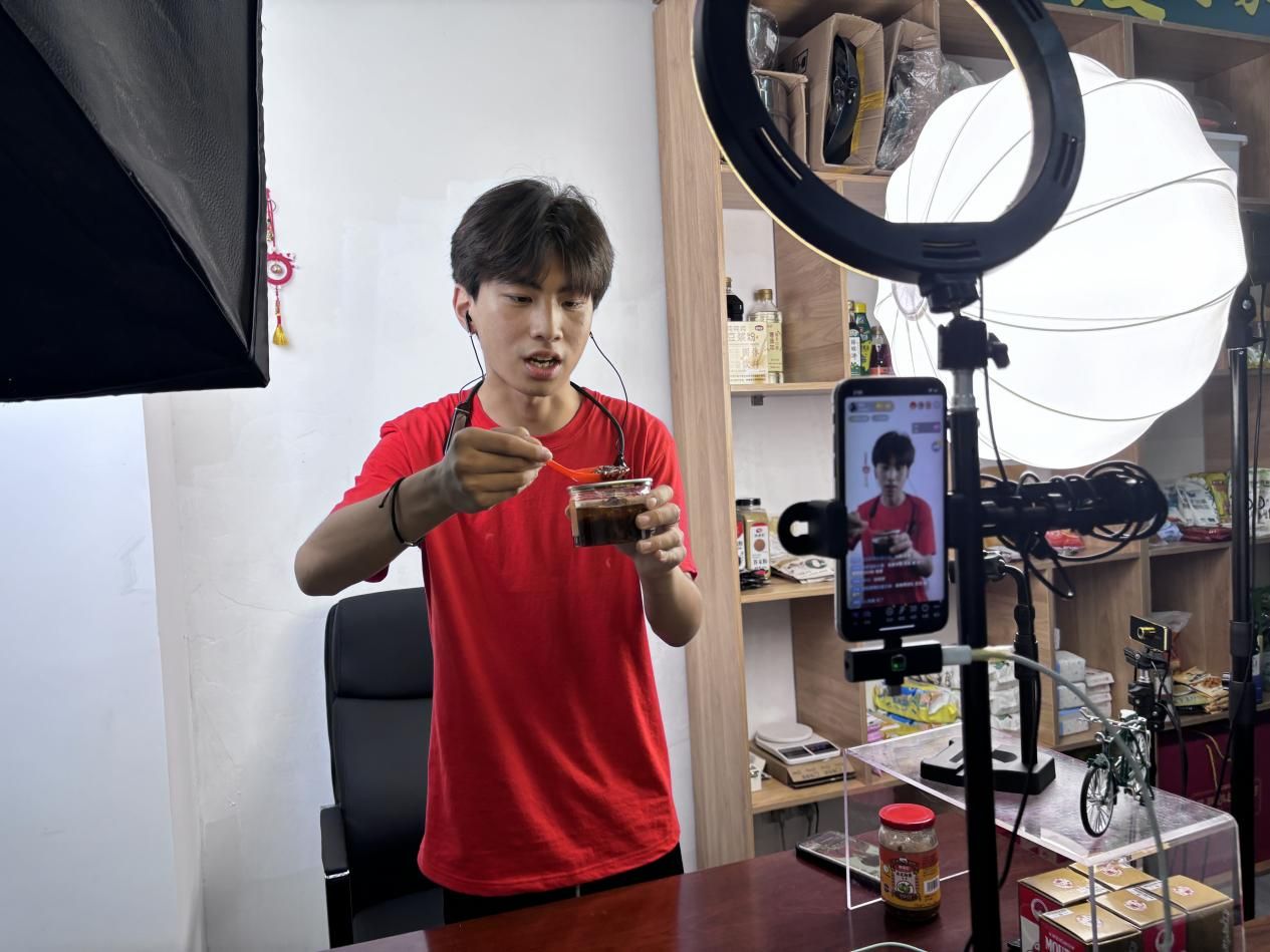直播期間,大學生主播們以真誠的態度和專業的素養,向觀眾展示了雙廟李村的特色農副產品。他們通過試吃、互動等方式,生動地介紹了魚頭醬、核桃油、調料品等產品,并熱情回答網友的提問,與網友們進行了愉快的互動。一個鏡頭、一張桌子、一部手機,一頭連著雙廟李村的特色農副產品,一頭連著無數網友。通過直播平臺,廣大網友看到了鄭州財經學院商學院的學生們化身“帶貨主播”,用自己的所學所看展示著雙廟李村的特色農副產品,為實現鄉村振興注入了強大的青春活力。