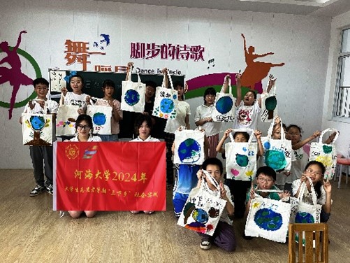 此外,實踐團還為孩子們準備了環保繪畫材料,引導他們在帆布袋上繪制以“保護地球”為主題的畫作。這些畫作不僅色彩鮮艷、充滿童趣,更是孩子們對保護環境的美好愿望和期待的體現。
