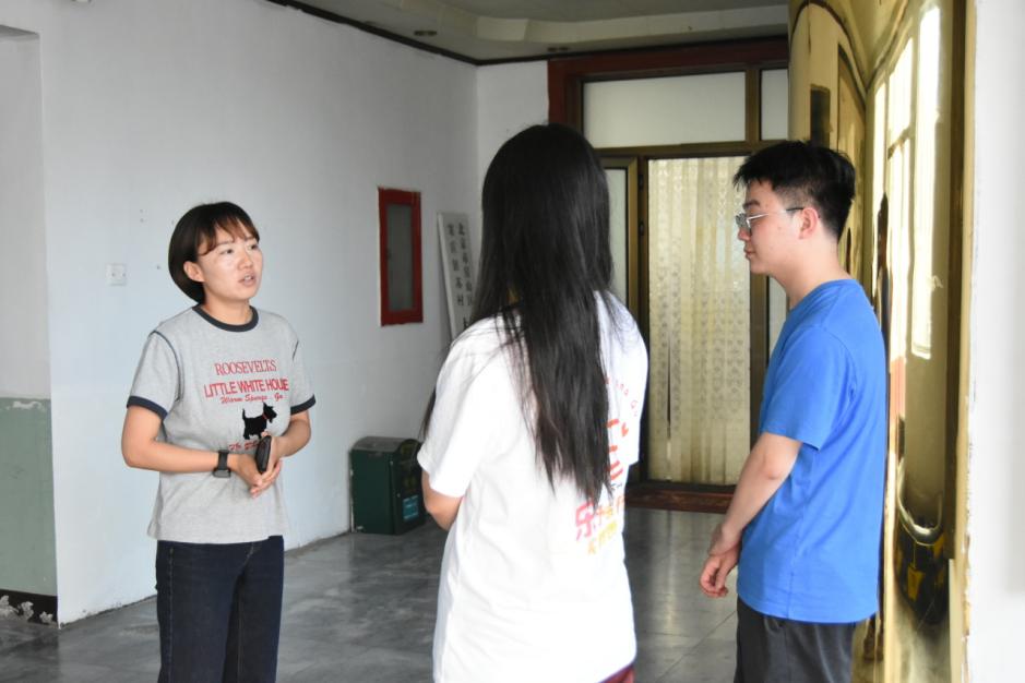 圖為團隊成員采訪外墻被沖塌的阿姨。劉子琦 供圖