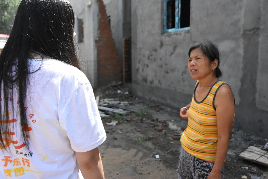 圖為團隊負責人劉馨怡訪談一位房屋依舊未建好的女性。 通訊員劉子琦 攝