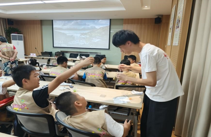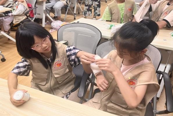圖為小朋友們?cè)谶M(jìn)行創(chuàng)傷包扎的實(shí)操演練 通訊員袁錦皓供圖