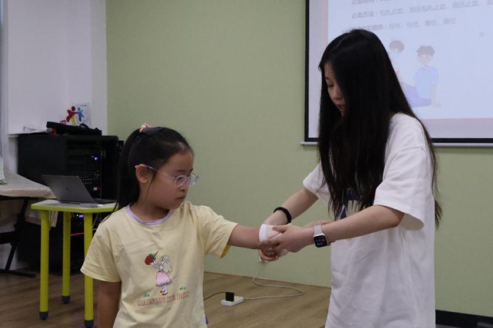 實踐團成員方鈺瑩教小朋友們止血包扎術。通訊員沈鑫楊供圖