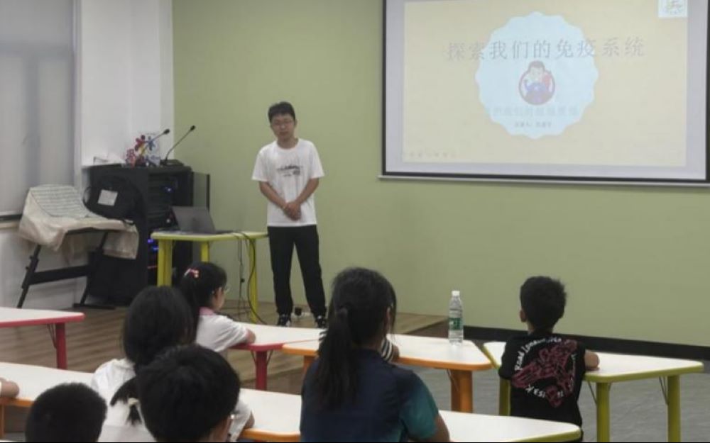 吳鑫宇同學為小朋友們講解了人體免疫系統(tǒng)的知識,主要涉及免疫系統(tǒng)的組成、運行方式等。同時提到人體的過敏反應,其實也與免疫系統(tǒng)相關。在課程中,吳鑫宇同學還和一位小男生一同演示了七步洗手法,盡管剛開始小男生的動作略有差錯,但在吳鑫宇同學的糾正下,小男生最終規(guī)范完成演示。