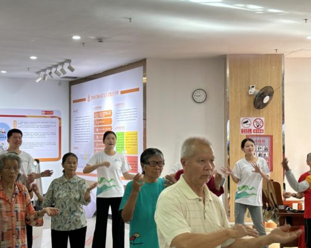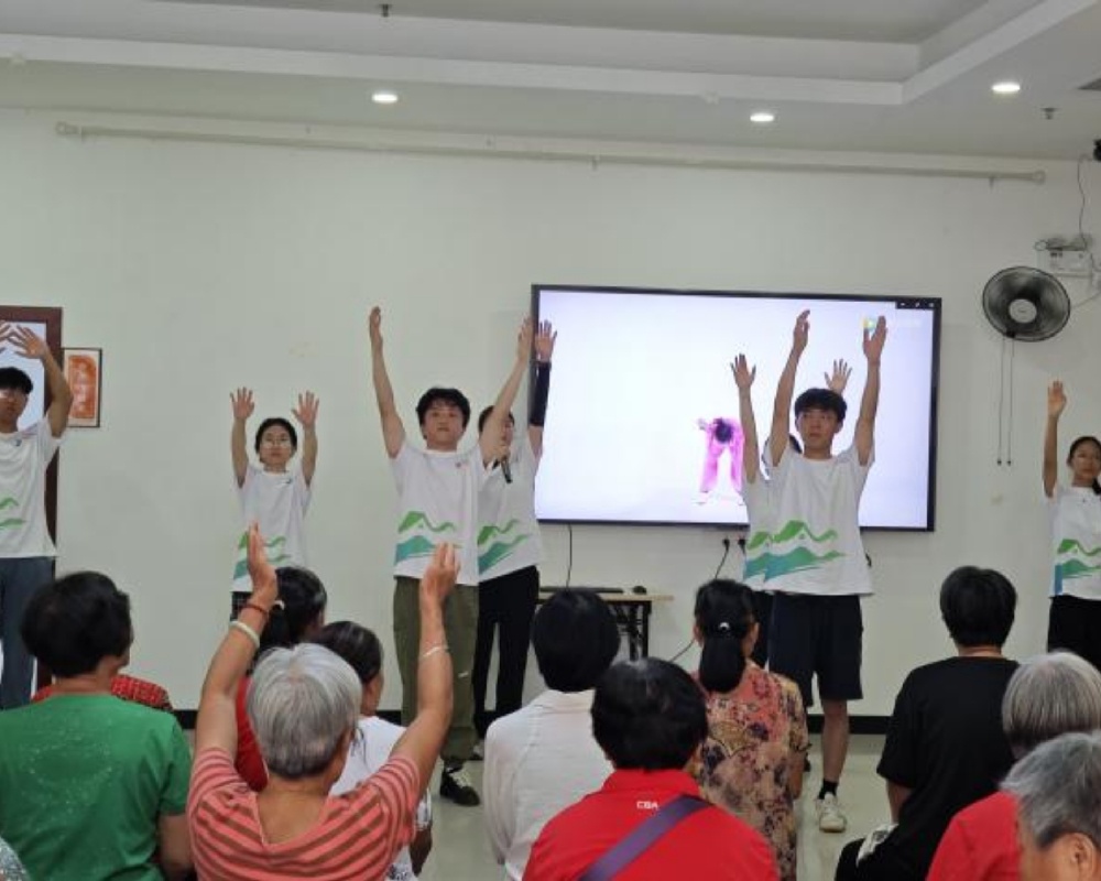 圖為實(shí)踐團(tuán)成員帶領(lǐng)老人們一起打八段錦。通訊員 劉向杰 供圖