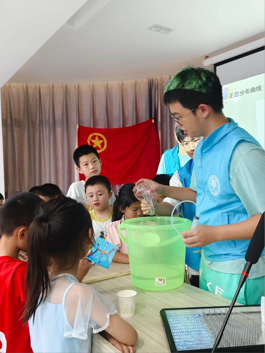 首堂課以“探索數(shù)學(xué)模型”為主題,為社區(qū)的孩子們帶來(lái)了一場(chǎng)別開生面的數(shù)學(xué)盛宴。課堂上,志愿者們運(yùn)用通俗易懂的語(yǔ)言,結(jié)合精心設(shè)計(jì)的互動(dòng)環(huán)節(jié),讓孩子們?cè)谳p松愉快的氛圍中學(xué)習(xí)數(shù)學(xué)。志愿者們巧妙地利用高爾頓釘板模型,展示了顆粒物在重力作用下底部后,如何形成完美的正態(tài)分布曲線。孩子們通過(guò)這一直觀示,不僅深刻理解了概率和統(tǒng)計(jì)中的正態(tài)分布概念,還直觀地感受到了數(shù)據(jù)分布的規(guī)律性和美感,從而增強(qiáng)了對(duì)數(shù)據(jù)分布的認(rèn)識(shí)。同時(shí),克萊因瓶這一神秘模型的引入,讓孩子們領(lǐng)略了拓?fù)鋵W(xué)的無(wú)限魅力,激發(fā)了他們對(duì)高維空間和非歐幾何的無(wú)限遐想。