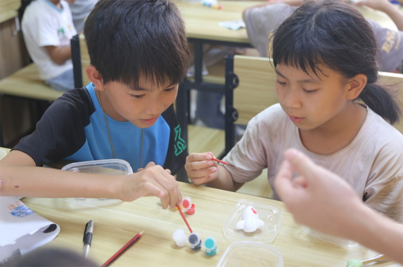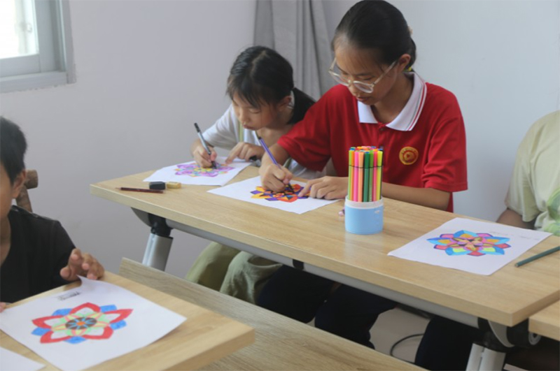 “藝術·浸潤心靈之旅”中,實踐隊播放心理影片帶領孩子們與情緒小精靈一同探索情緒的奧秘;通過“石膏娃娃情緒涂鴉”和“彩繪曼陀羅,我手畫我心”創造美、欣賞美,以美潤心、向美而行。