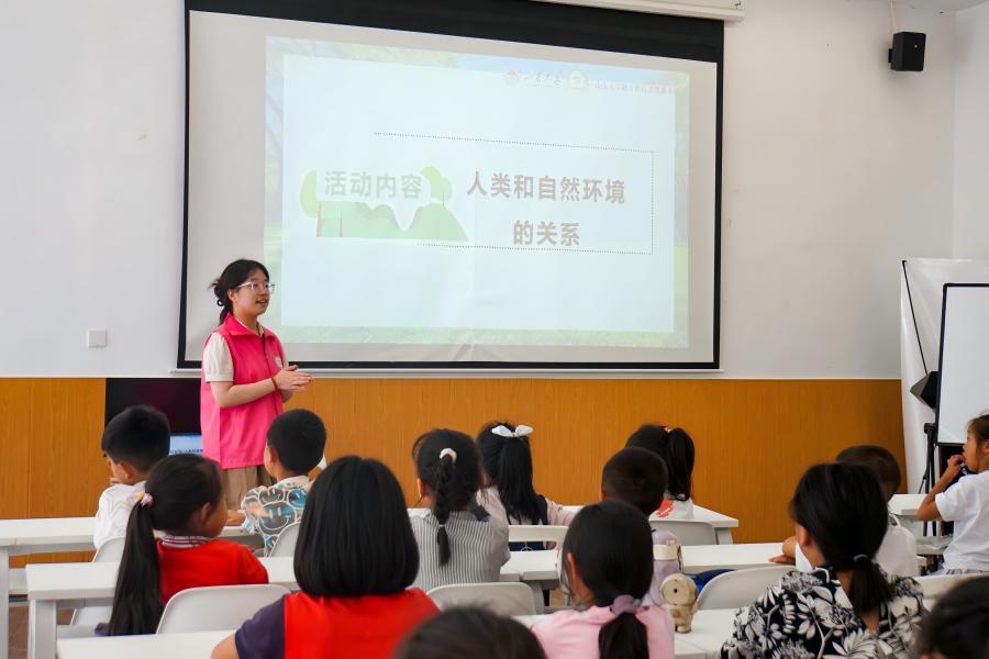 下午兩點半,支教隊伍開始了豐富多彩的授課活動。在“七彩假期”專項活動課程中,隊員吳彥林向學生介紹了古典青花瓷的魅力,和學生在畫筆描繪中感受中華優秀傳統文化的深厚底蘊;在綠色環保類課程中,隊員寧彩羽帶學生了解當下氣候問題,并認識到“雙碳”政策的重要性以及清潔能源發展的廣闊前景。另外兩位隊員則立足自身專業背景,結合學生的實際生活需求,講授了別開生面的科普課程。其中,來自控制學院的隊員戴晶晶結合自動化專業,向學生講授了電子技術及安全用電知識;而來自藥學院的隊員謝銀政則講授了日常用藥規范與急救防護基本技能,幫助學生提高自身防護能力。在地理文化課程中,隊員戴晶晶還巧妙地融合了貴州特有的喀斯特地貌,以生動的語言講述了地形地貌的趣味知識,引人入勝,和學生一起感受烏蒙大地的秀美青山。特色課程結束后,隊員們根據低年級、中年級和高年級學生的不同學情,有針對性地開展了課業輔導工作。